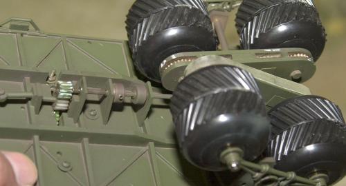 左右別個にスウィングし且つ4輪駆動をさせるために、車体上部に背負ったモーターからタイヤ軸までに21個のギヤが噛み合っています。