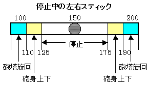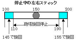 ![]() 前進・後進スティックが中間の停止してる時に、左右スティックをいっばいに切ると、砲塔が微速で旋回します。 |