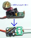 上のプログラムでは、さらに走行用アンプのセンター位置(停止位置)を左右別々に設定・登録できるようになっています。 サーボバラシのアンプは小型で便利なんですが、アンプの中間(停止)位置を設定するポテンショメーターが結構邪魔になる...(特に小さいキットに組み込もうとすると) どうせ、中間(停止)位置は、固定でしか使わないのだから、ポテンショメーターの代わりに固定抵抗をつければ、さらに小さく、組み込みやすくなる!!