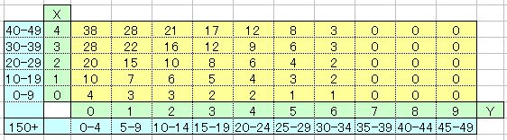 縦のX軸が、前進・後進スティックの増加量 横のY軸が、左右旋回スティックの増加量 前進・後進を5段階に分けて、それぞれの段階ごとに左右旋回の値を決めています。 左右旋回は10段階だけど、最後の3段階は新地旋回・超新地旋回に固定されているので、緩旋回は7段階になります。 表の黄色い部分の数値に150(停止の値)を足した(引いた)値が、アンプに送られるます。 例えば、前進スティックが185で、左右旋回スティックが172の時は、Xは3段階目・Yは4段階目になり、値は「9」で、アンプに送るときは、150+9で、159を送ります。 実際のプログラム→t1h.asm | |