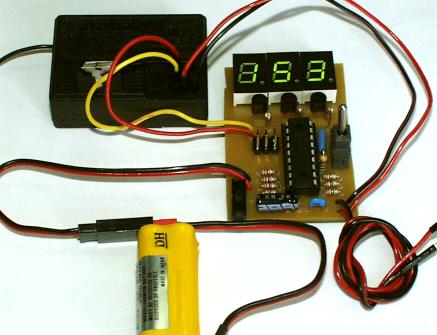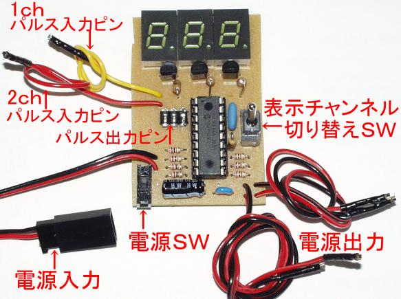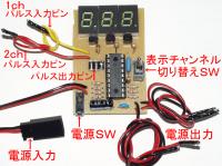 受信機からサーボやアンプを制御するパルスの幅(ONの時の時間)は、1mSから2mSで、これをプログラムで使いやすいように、100〜200の数値に変換しています。 プロポのスティックの中間が150で、上が100、下が200と仮定してプログラムを作ってますが、実際にはプロポのメーカーの違いで若干のずれがあります。 今回製作した、パルス幅測定器は、受信機から出る信号を3桁の数値(80〜250)で表示します。 これを使えば、自分の持っているプロポの、センターや上・下のパルス幅が確認できます。 また、自分が作ったPICから予定通りのパルスが出力されているかどうか、数値で確認することも出来るので、PICでラジコンメカの制御をするには大変便利な装置です。 | |