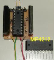 最初に、モーターをコントロールするのに、東芝のTA7291Pと言うIC(いろんな作例で使われている)を使ってみました。 PICと直結で2本制御ピンでコントロール出来るのは便利ですが、130モータークラスでも触れないくらいの発熱で、しかもモーターに供給される電圧が落ちるようで、スピード・トルクとも満足いきませんでした。 あと、TA7289Pや似たようなICも使ってみましたが同じでした。 で、何とか使えそうなのが、東芝のMP4212と言うFETモジュールでした。 当初なかなか手に入りませんでしたが、最近のロボット工作ブームのせいか(間違っても可動戦車ブームでは無いぞ)、通常在庫として取り扱っているショップが出てきました。 ただ、このFETは、PICと直結出来なかったり、制御に4ピン必要だったり(デジタルICを追加すれば2ピンで制御も可能みたいだけど、基板のサイズが大きくなるし...) さらには、PICと同じ電源でモーターをまわそうとすると、PIC側の電圧が下がってしまう為かPICは暴走するし....と、結構厄介なドライバーです....って、FET使えば当たり前のことかも..(^^;; | ![]() |