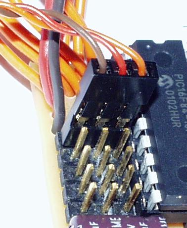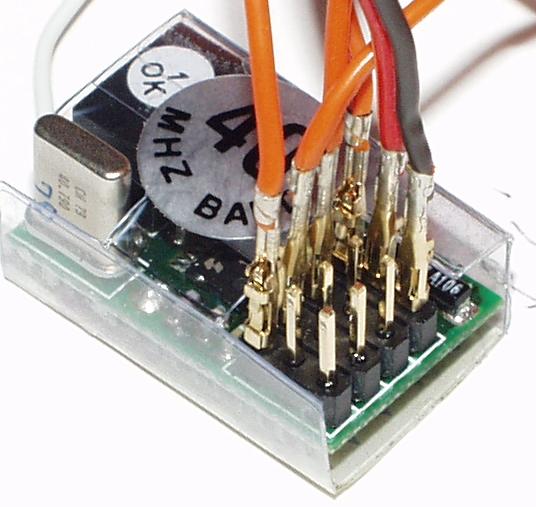 受信機との接続は、4本の信号ピンと、電源用の[+][−]ピンの2本を、バラで差し込みます。 信号ピンは基板左上段の4本で、右より順に、 [RA0]左右旋回用チャンネル。(エルロン)(GWS・モデルクラフトFeatherは[2]へ) [RA1]前進・後進用チャンネル。(エレベータ)(GWS・モデルクラフトFeatherは[3]へ) [RA2]砲身上下用チャンネル。(スロット)(GWS・モデルクラフトFeatherは[1]へ) [RA3]砲塔旋回用チャンネル。(ラダー)(GWS・モデルクラフトFeatherは[4]へ) 基板より受信機の電源供給用の、[+][−]ピンは、ほとんどの受信機はどのチャンネルに繋いでもOKですが、+と−を逆に繋がないように注意してください。 (赤が+です。) 受信機の接続ピン同士が、接触しないように気をつけて下さい。 |