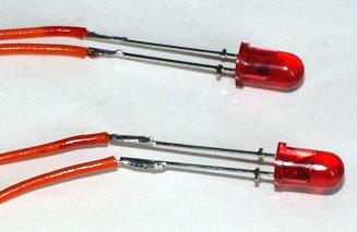 LEDは、10mA〜20mAで点灯する(一般的な?)物を使ってください。 出荷時は、テスト用に繋いだ安い(暗い?)LEDが付いています。 LEDを繋ぎかえるときは、+・−に注意してください。 LEDの足の長い方が+です。 |