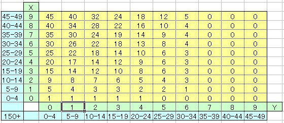 縦のX軸が、前進・後進スティックの増加量 横のY軸が、左右旋回スティックの増加量 前進・後進を5段階に分けて、それぞれの段階ごとに左右旋回の値を決めています。 左右旋回は10段階だけど、最後の3段階は新地旋回・超新地旋回に固定されているので、緩旋回は7段階になります。 表の黄色い部分の数値に150(停止の値)を足した(引いた)値が、アンプに送られるます。 例えば、前進スティックが185で、左右旋回スティックが172の時は、Xは3段階目・Yは4段階目になり、値は「9」で、アンプに送るときは、150+9で、159を送ります。 実際のプログラム→t1h.asm | |