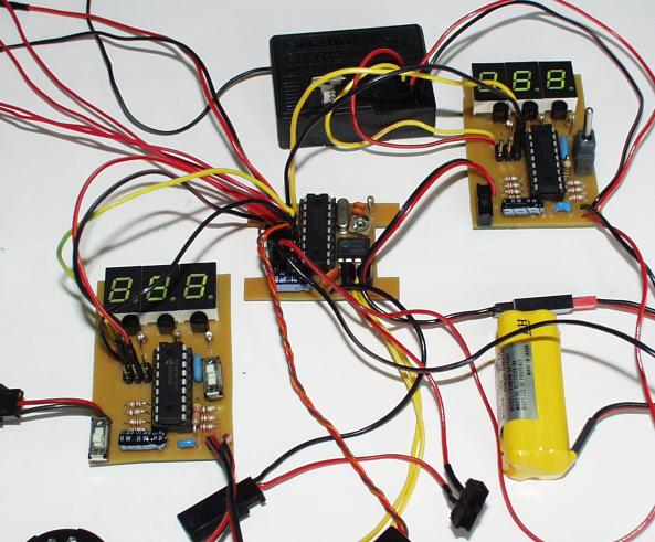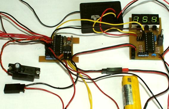 受信機からサーボやアンプを制御するパルスの幅(ONの時の時間)は、1mSから2mSで、これをプログラムで使いやすいように、100〜200の数値に変換しています。 プロポのスティックの中間が150で、上が100、下が200と仮定してプログラムを作ってますが、実際にはプロポのメーカーの違いで若干のずれがあります。 今回製作した、パルス幅測定器は、受信機から出る信号を3桁の数値(80〜250)で表示します。 これを使えば、自分の持っているプロポの、センターや上・下のパルス幅が確認できます。 また、自分が作ったPICから予定通りのパルスが出力されているかどうか、数値で確認することも出来るので、PICでラジコンメカの制御をするには大変便利な装置です。 | |