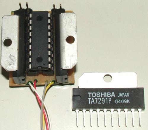 最初に、モーターをコントロールするのに、東芝のTA7291Pと言うIC(いろんな作例で使われている)を使ってみました。 PICと直結で2本制御ピンでコントロール出来るのは便利ですが、130モータークラスでも触れないくらいの発熱で、しかもモーターに供給される電圧が落ちるようで、スピード・トルクとも満足いきませんでした。 あと、TA7289Pや似たようなICも使ってみましたが同じでした。 で、何とか使えそうなのが、東芝のMP4212と言うFETモジュールでした。 当初なかなか手に入りませんでしたが、最近のロボット工作ブームのせいか(間違っても可動戦車ブームでは無いぞ)、通常在庫として取り扱っているショップが出てきました。 ただ、このFETは、PICと直結出来なかったり、制御に4ピン必要だったり(デジタルICを追加すれば2ピンで制御も可能みたいだけど、基板のサイズが大きくなるし...) さらには、PICと同じ電源でモーターをまわそうとすると、PIC側の電圧が下がってしまう為かPICは暴走するし....と、結構厄介なドライバーです....って、FET使えば当たり前のことかも..(^^;; | ![]() |