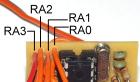 受信機との接続は、4本の信号ピンと、電源用の[+][−]ピンの2本を、バラで差し込みます。 信号ピンは基板左上段の4本で、右より順に、 [RA0]左右旋回用チャンネル。(エルロン)(GWS・モデルクラフトFeatherは[2]へ) [RA1]前進・後進用チャンネル。(エレベータ)(GWS・モデルクラフトFeatherは[3]へ) [RA2]砲身上下用チャンネル。(スロット)(GWS・モデルクラフトFeatherは[1]へ) [RA3]砲塔旋回用チャンネル。(ラダー)(GWS・モデルクラフトFeatherは[4]へ) 基板より受信機の電源供給用の、[+][−]ピンは、ほとんどの受信機はどのチャンネルに繋いでもOKですが、+と−を逆に繋がないように注意してください。 (赤が+です。) 受信機の接続ピン同士が、接触しないように気をつけて下さい。 |