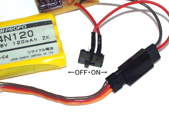 電源用バッテリーは受信機用のニッカド4.8V(JR・Futaba)を使用してください。 電源スイッチは、コード側がON、コードと反対側がOFFです。 バッテリー接続時は、必ず電源スイッチをOFFにしておいて下さい。 電源は、プロポ(送信機)を先にONにしてから、基板の電源を入れてください。 電源をONにした直後にノイズ等の影響で誤動作する事があります。 その時は、電源を一旦切って、再度付けなおして下さい。 |